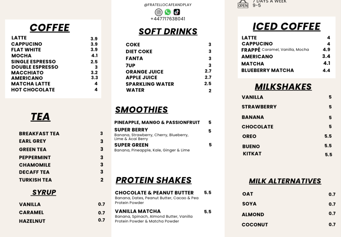 For those who love sweets, the milkshake selection at Fratello is nothing short of tantalizing. Crafted with care, the Oreo Milkshake (£5.50) and the indulgent Chocolate Milkshake (£5.00) will surely bring a smile to your face, making them the perfect treat after a bit of playtime.
